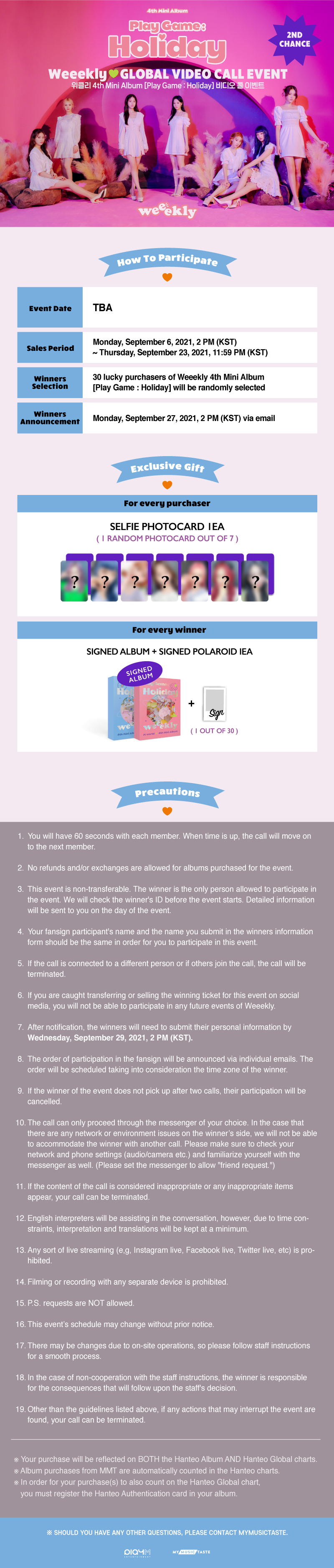 ![Weeekly - 4th Mini Album [Play Game : Holiday] Global Video Call Event](https://prodmsamedia.mymusictaste.com/cshopproject/images/46d67ab80eb711eca6b30a58a9feac02.jpeg)